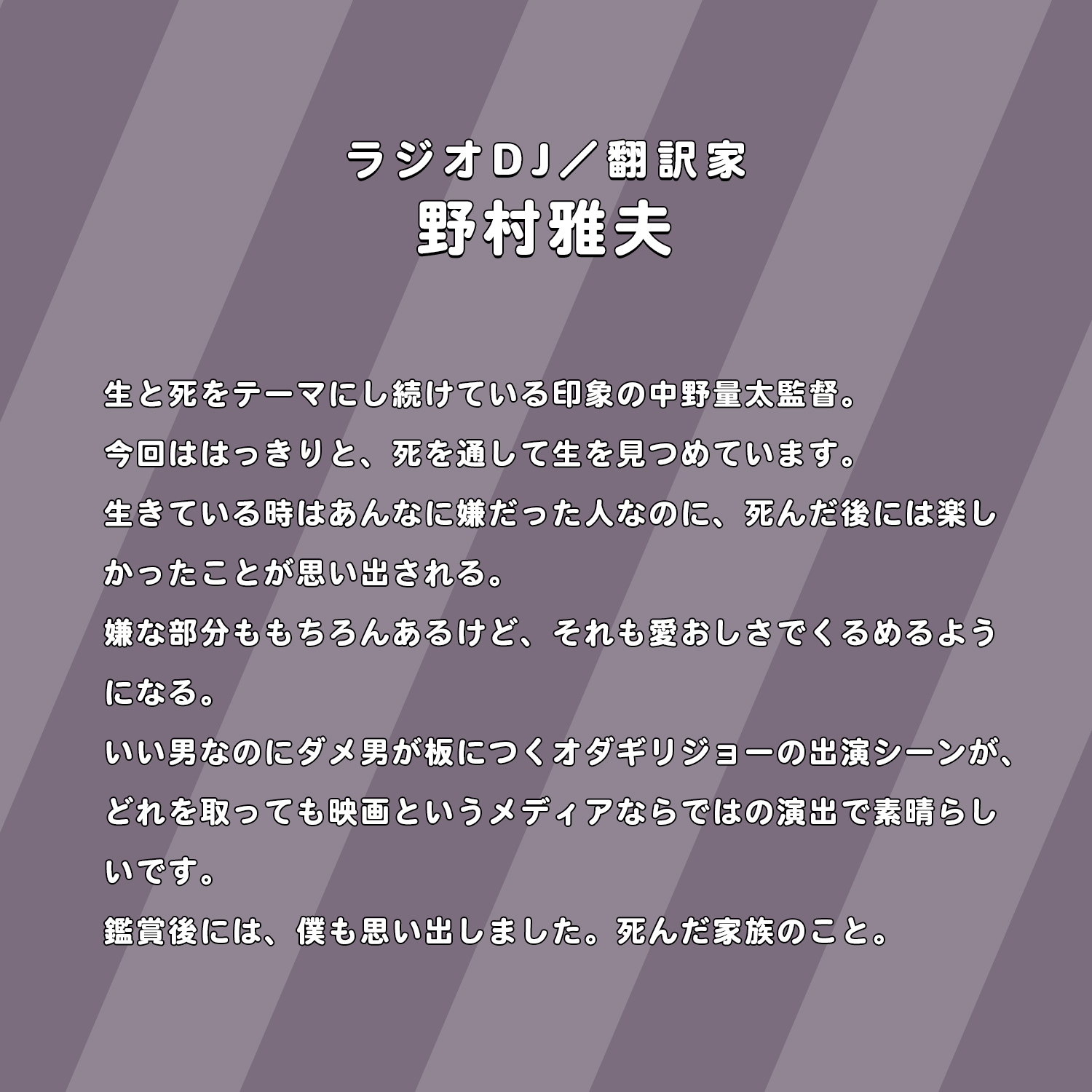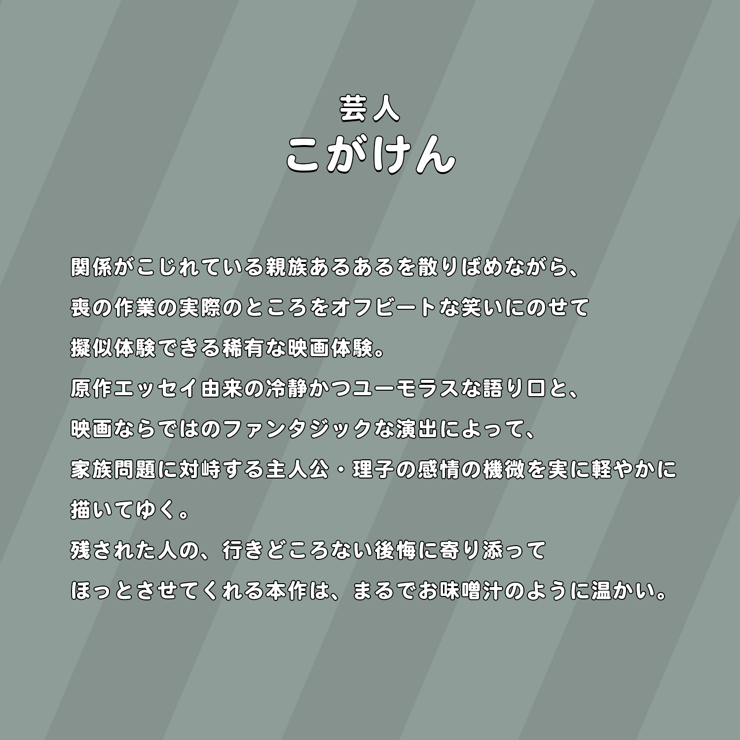 「涙がとまりませんでした」、「大切な人のことを考える」、「私は家族のことを何も知らなかった」、「自分と重ねて観てしまった」といった、自分の家族のことを思い出したという観客の方々のリアルなコメントが次々と映し出される。さらに、「笑えるのになぜか泣ける」、「前向きになれる」、「とても救われる気持ちになる」など、作品が<前を向く力>を与えてくれたというコメントも。