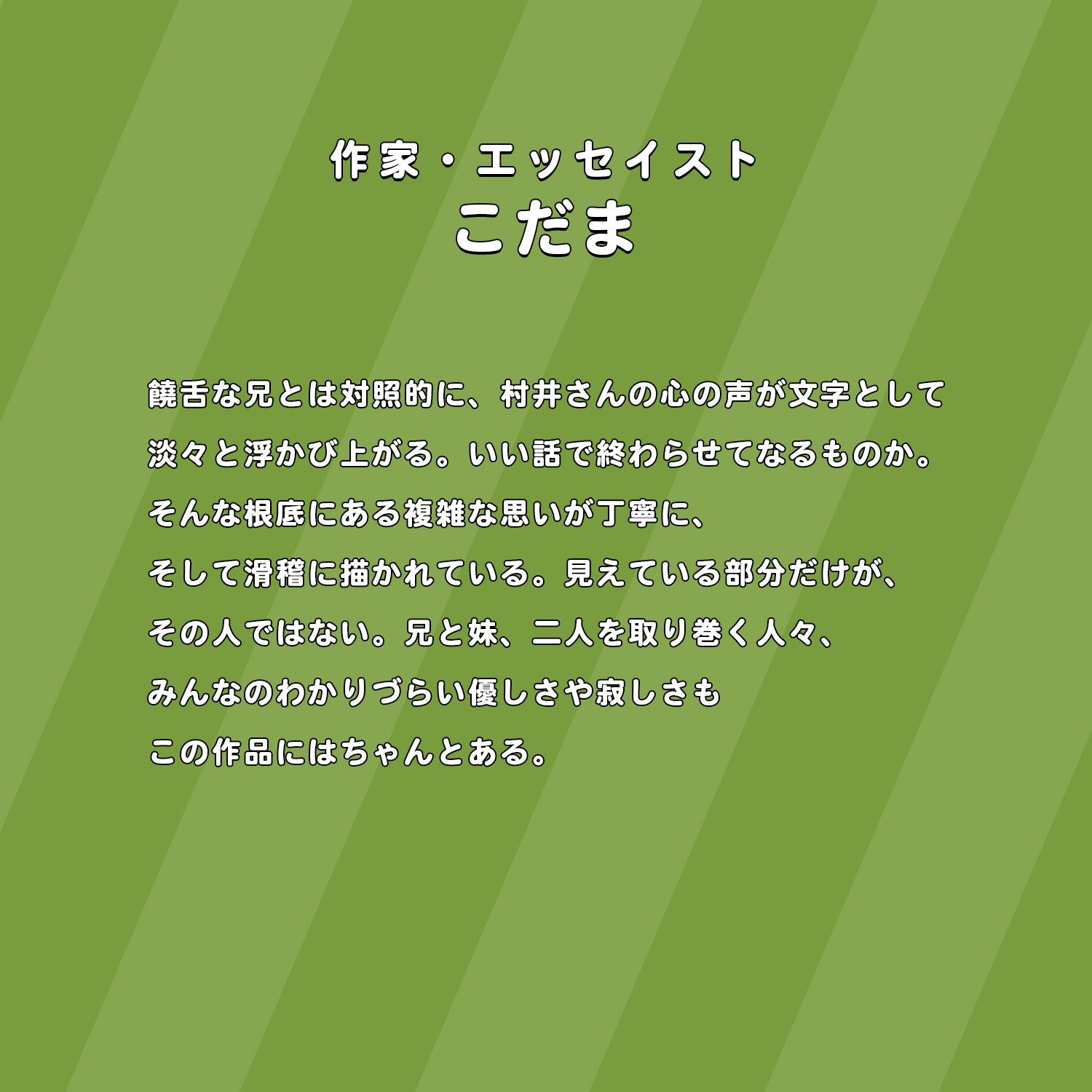 「涙がとまりませんでした」、「大切な人のことを考える」、「私は家族のことを何も知らなかった」、「自分と重ねて観てしまった」といった、自分の家族のことを思い出したという観客の方々のリアルなコメントが次々と映し出される。さらに、「笑えるのになぜか泣ける」、「前向きになれる」、「とても救われる気持ちになる」など、作品が<前を向く力>を与えてくれたというコメントも。